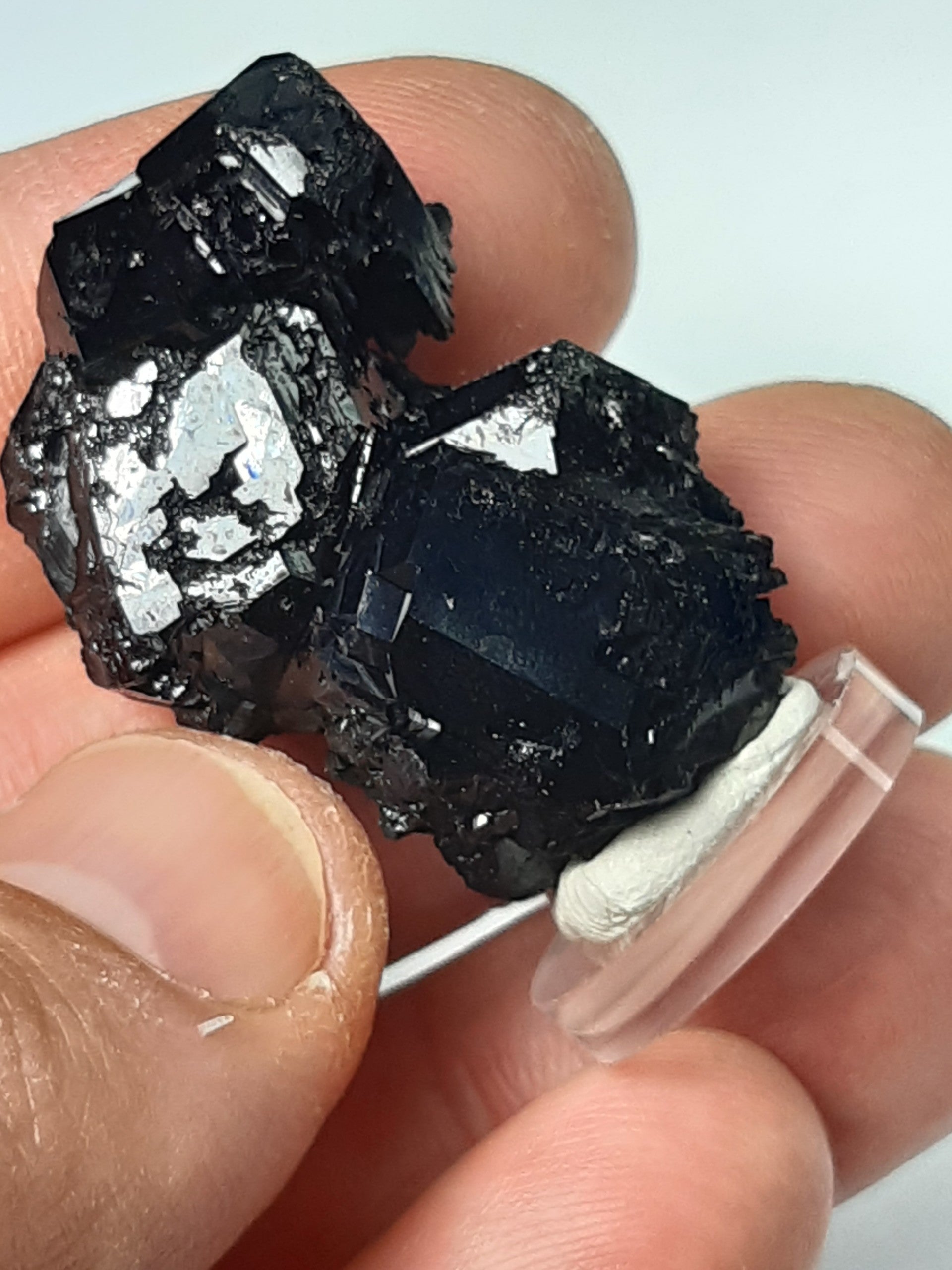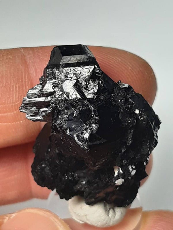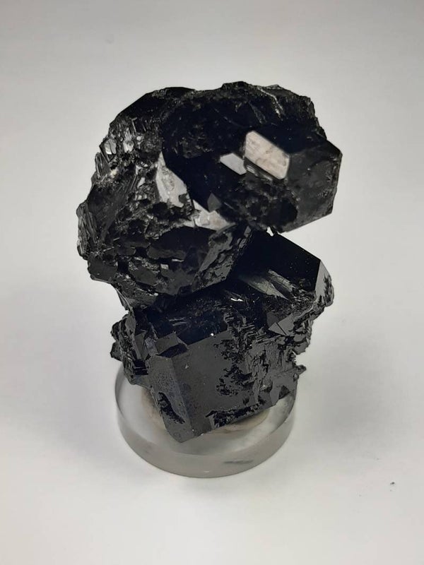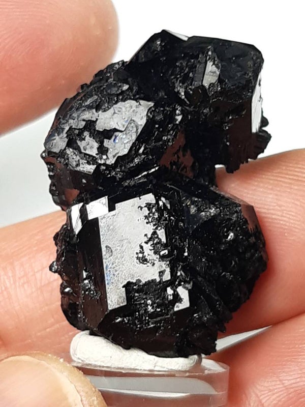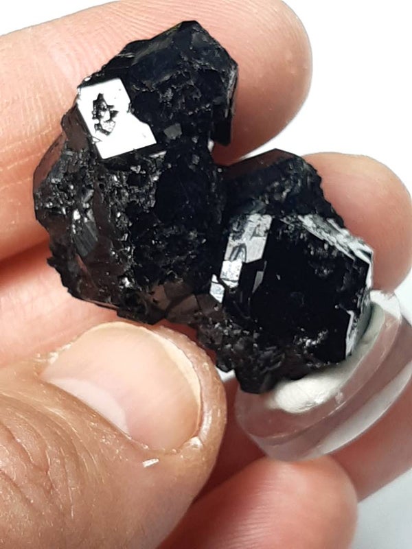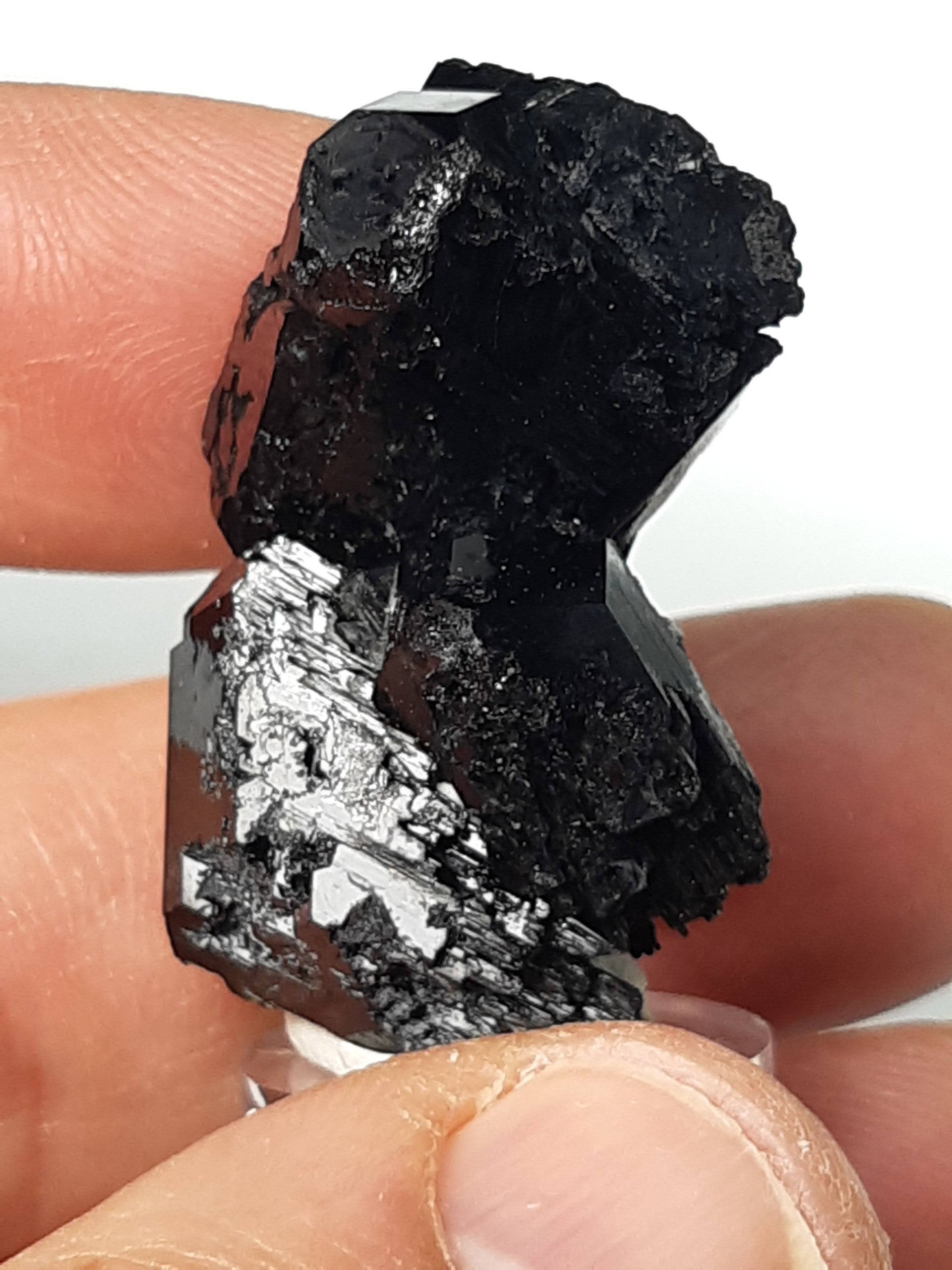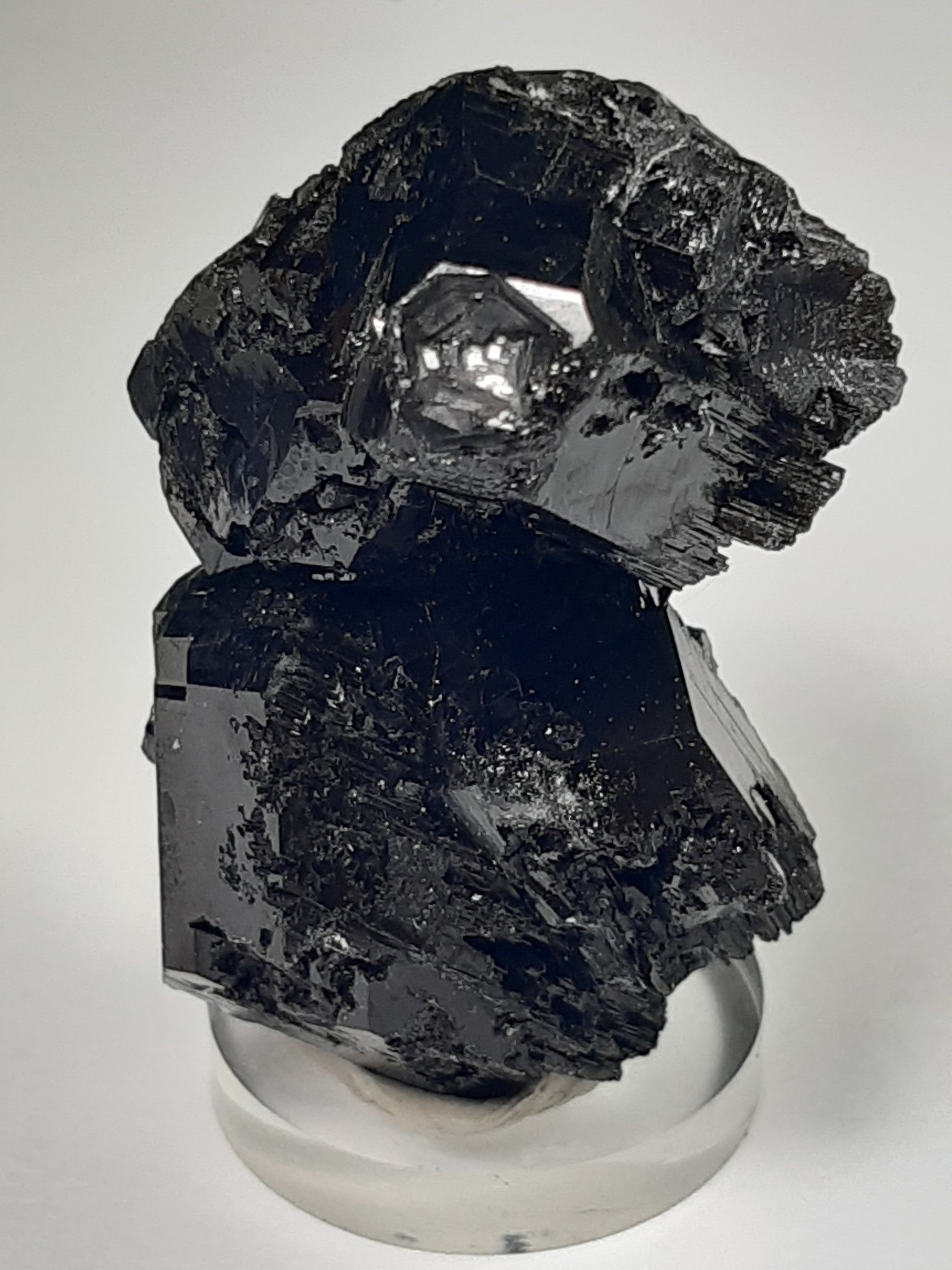 Unusual piece of very lustrous, nicely formed, part natural etched, pitch black tourmaline var. schorl twin crystals. Top for the schorl species. From famous Erongo.