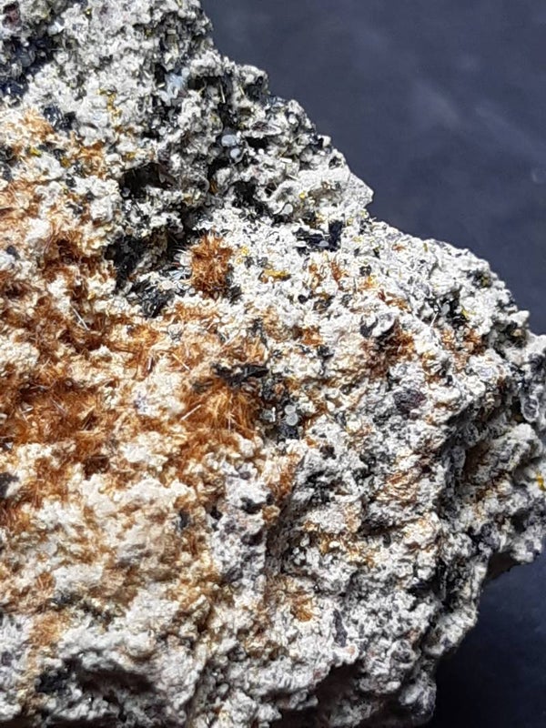 Nice very rare specimen of delicate, bright honey-brown acicular yuanfuliite crystals with spheroidal calcite and hematite on a lamproite matrix. Great collector piece. Fluor-richterite als lemon yellow flattened crystals.