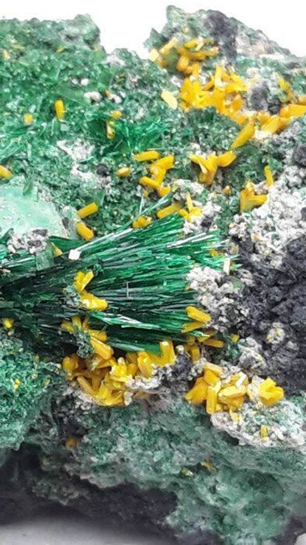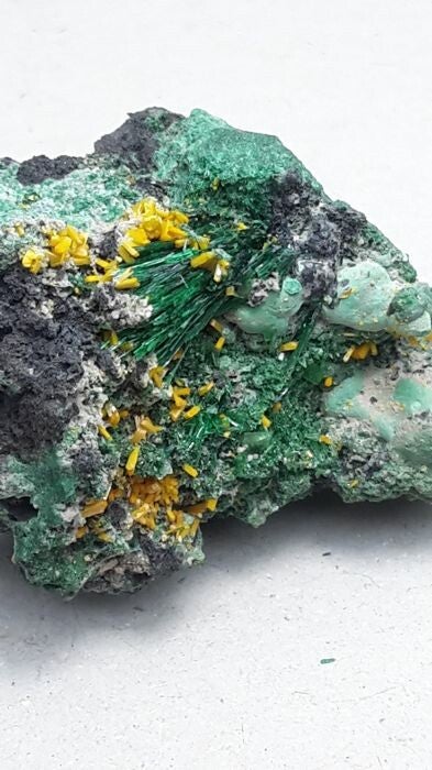 A very colourful and richly crystallised specimen of a dense mass of brilliant green needles of cuprosklodowskite and lustrous, apple green tabular crystals of torbernite with bright yellow stout prismatic kasolite (also called droogmansite) makes this a real winner. On a malachite matrix. Rare uranium minerals together in this stunning specimen.