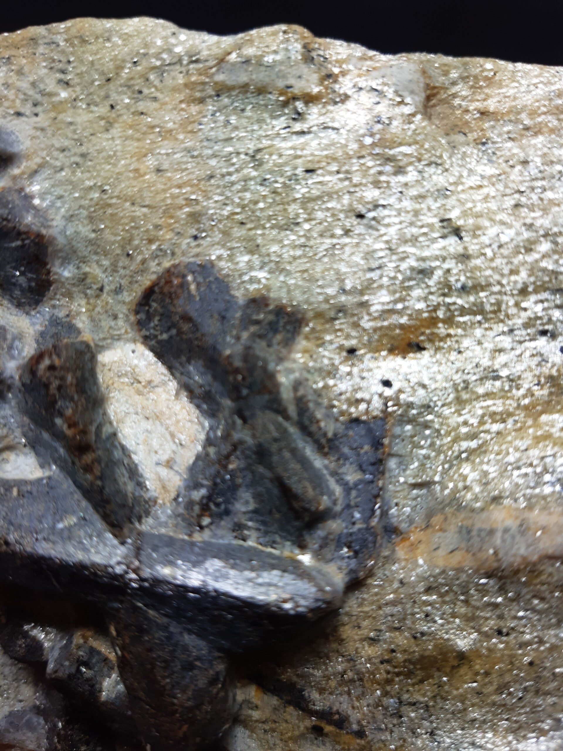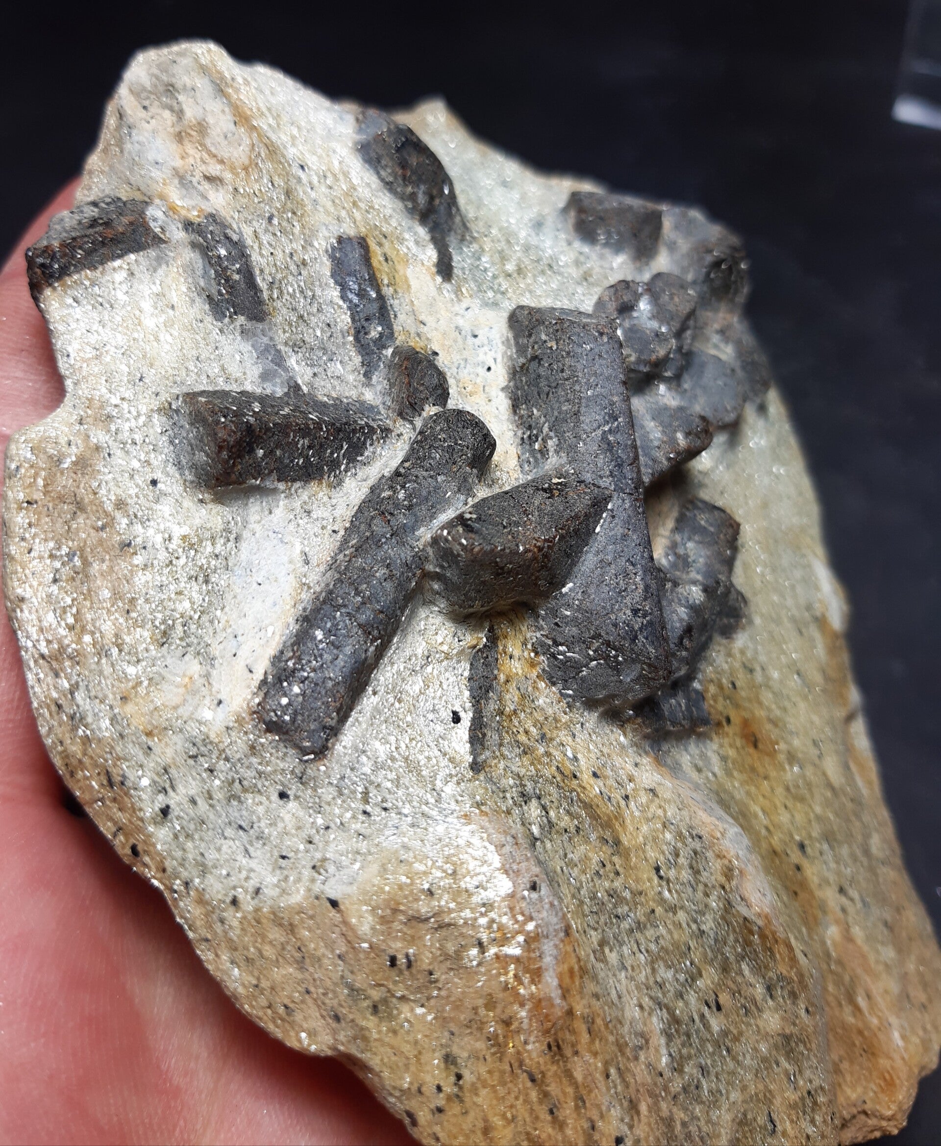 Staurolite crystals simulating the typical 60° Saint Andrew's cross embedded in golden to silvery mica schist.