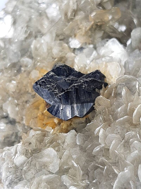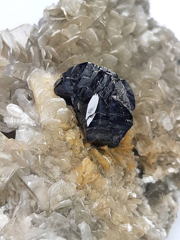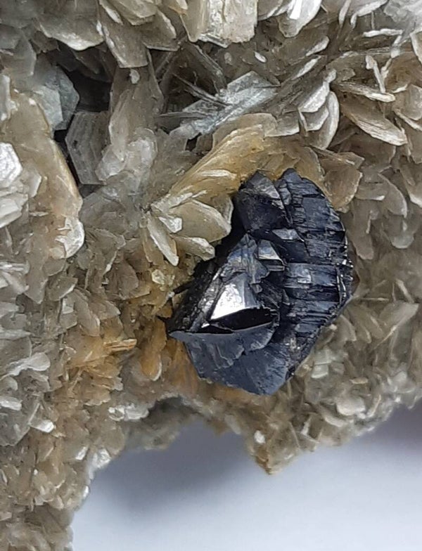 This superb specimen features one lustrous, well-developed crystal of black colored cassiterite on a silvery muscovite mica matrix. Cassiterite (tin oxide) has been the chief tin ore throughout ancient history and remains the most important source of tin today.