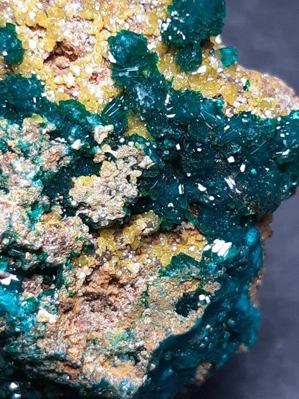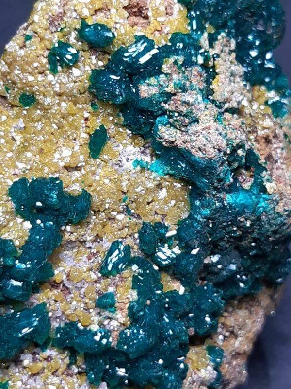 Very nice specimen of highly lustrous "roses" of deep emerald dioptase together with contrasting bright yellow mimetite crystals.