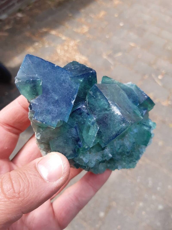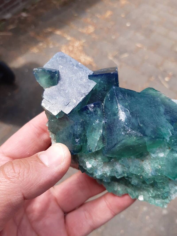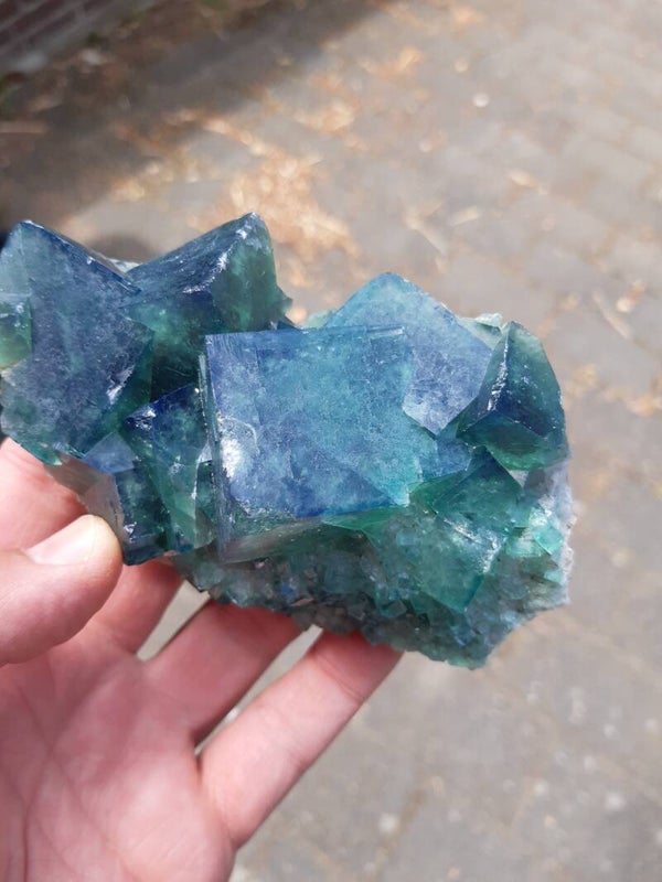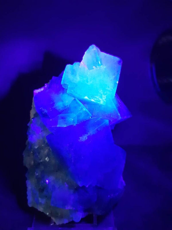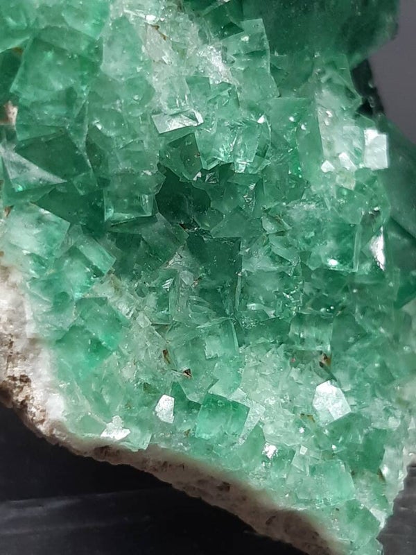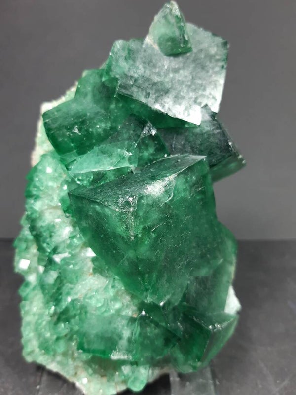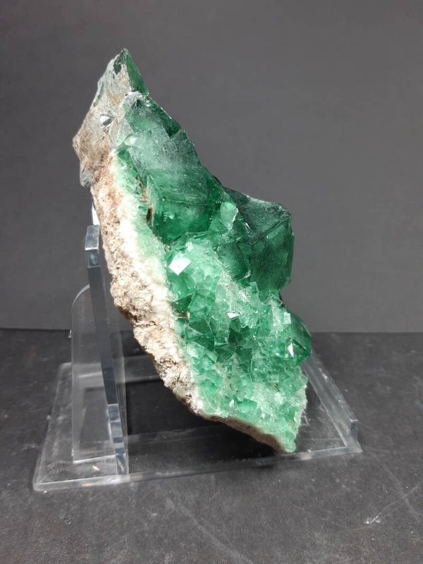 Beautiful sharp handpiece of color change FLUORITE cluster from a NEW find with gemmy emerald/neon-green translucent fluorite cubes on the matrix. Reminds me very much of the Rogerley fluorites. Same characteristics but different location.