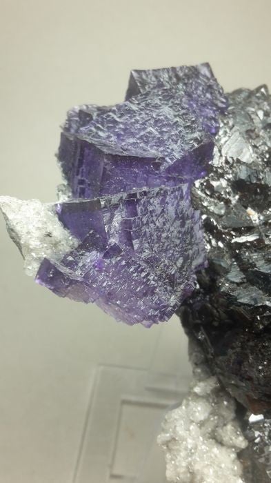 Exceptional and big specimen of large, intergrown, translucent violet fluorite cubes on very lustrous sphalerite and attached sparkly dolomite matrix. Beautifully undamaged. From classic Elmwood!