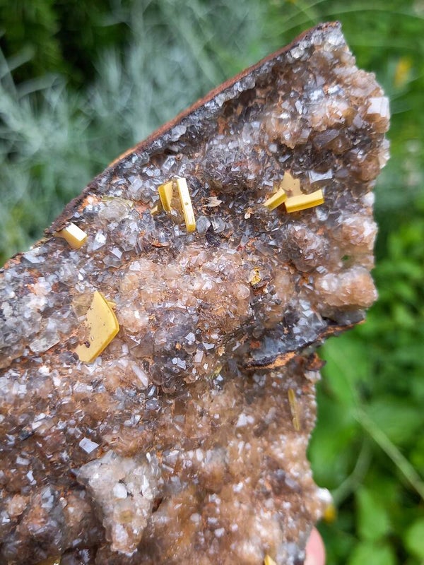 Aesthetic flat of butterscotch wulfenite (from which many have the "sandwich" form) on unconmon grey to brown calcite.