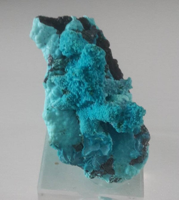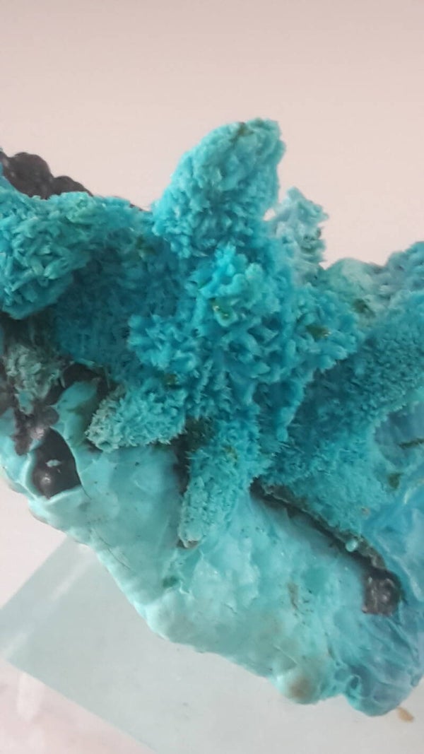 An eye-catching bright complex cluster of very sharp crystal forms that show clearly the original shape of the azurite crystals that were altered to malachite and are now nearly all chrysocolla! Also some black heterogenite present. A delicate specimen that is very 3-dimensional and a choice cast form.