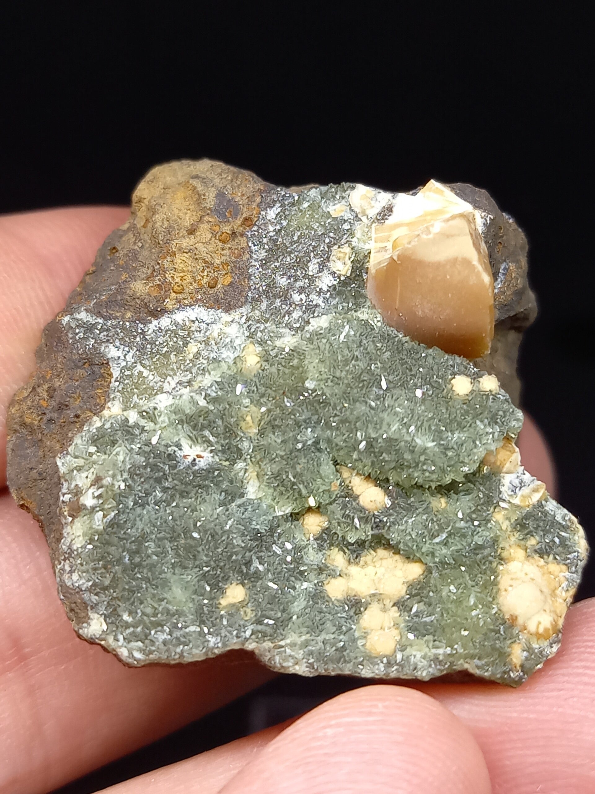 Lustrous, well crystallized apple-green crystals of rare anapaite on the matrix. This one even accompanied by the localty rare mineral baryte which is fluorescent too. A fine old specimen. An outstanding example of this rare Iron-phosphate mineral.