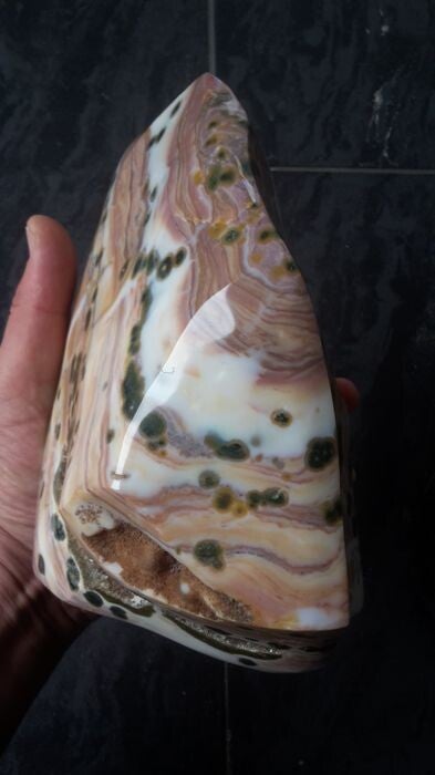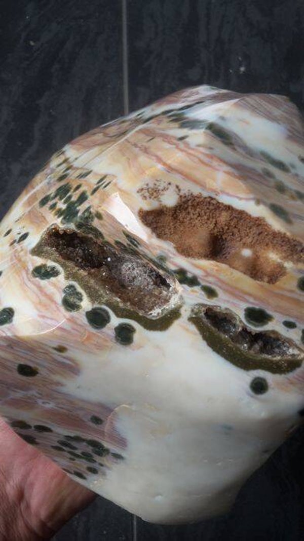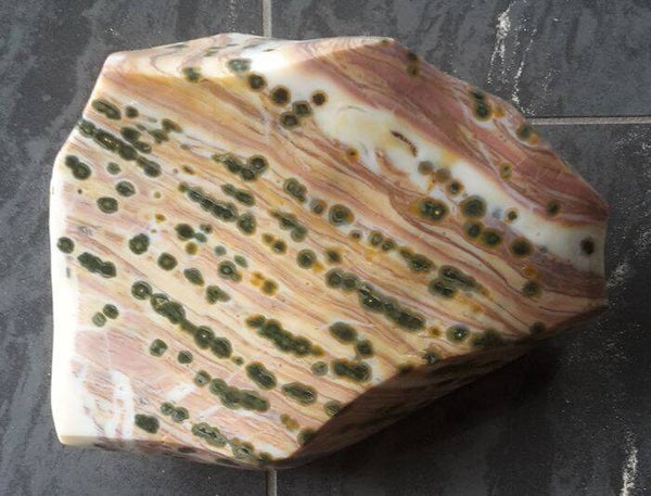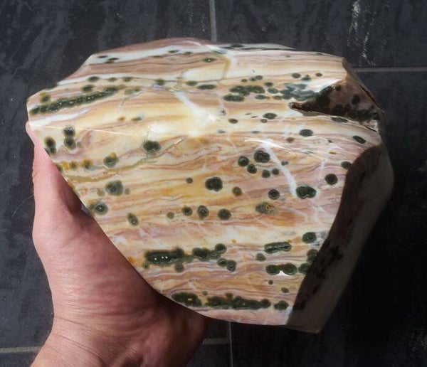 Huge, rare and lovely "Orbicular Ocean Jasper" with attractive pink, white yellow bands and green "eyes" and cavitys of sparkly quartz crystals. A beautiful, hand-shaped and polished piece of Orbicular Ocean Jasper coming from a remote location on the coast of Madagascar, where it can only be mined at low tide!